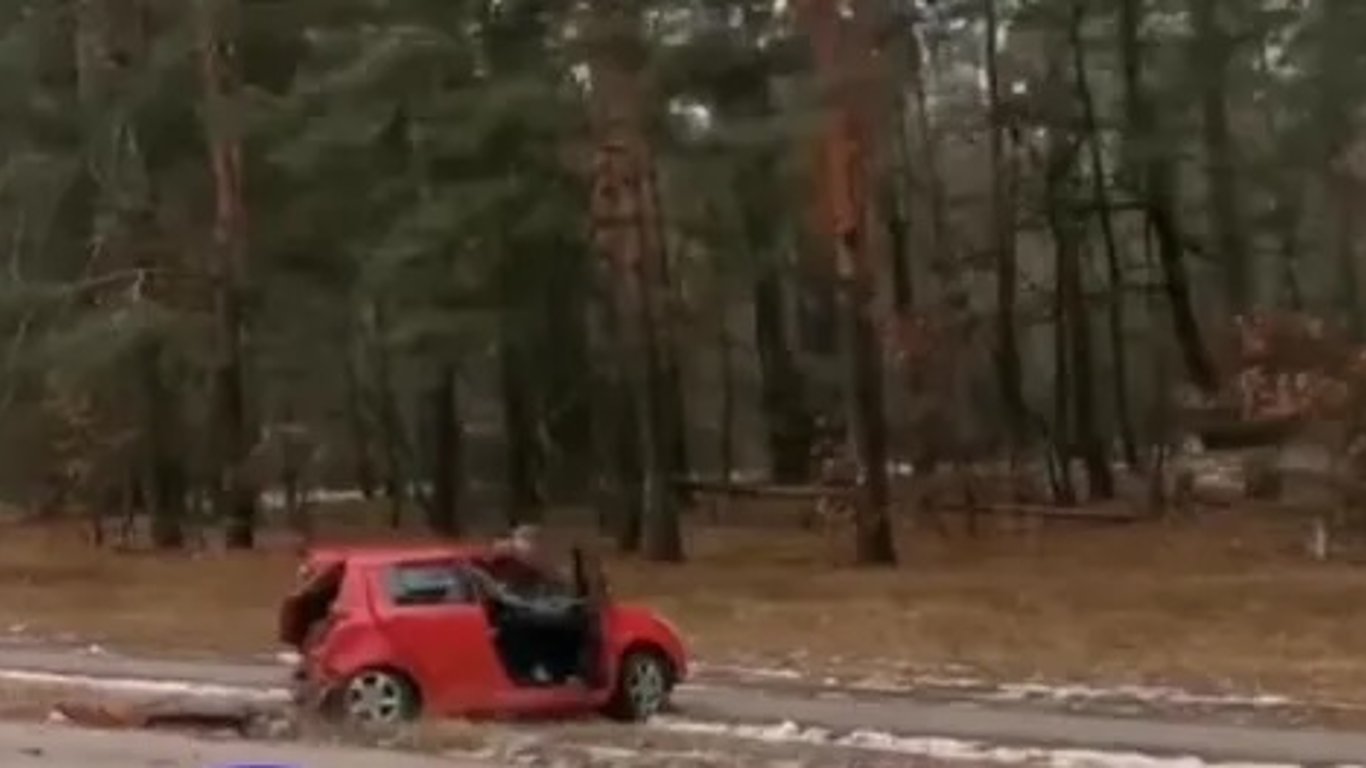 "ДТП. Жахливе, на Новоірпінський трасі. Дуже сильно зіштовхнулося два легковики, один — з розтрощеною задньою частиною — знесло на узбіччя", — вказано в описі під відео.