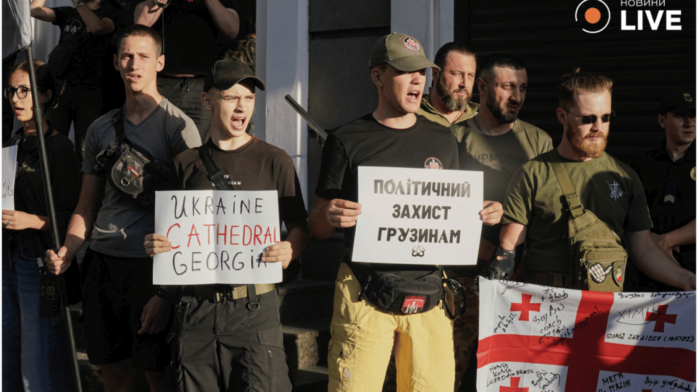 У Києві у понеділок, 29 липня, біля посольства Грузії відбувся мітинг проти переслідувань грузинських добровольців. Люди стояли під будівлею з плакатами та прапорами.