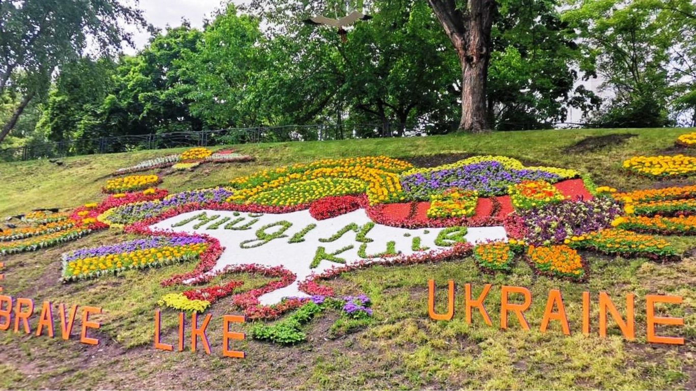 У парку "Відрадний" зʼявилася квіткова інсталяція, яка показує, що Україна — це 603 548 квадратних кілометрів. На Троєщині встановили гасло Be brave like Ukraine.