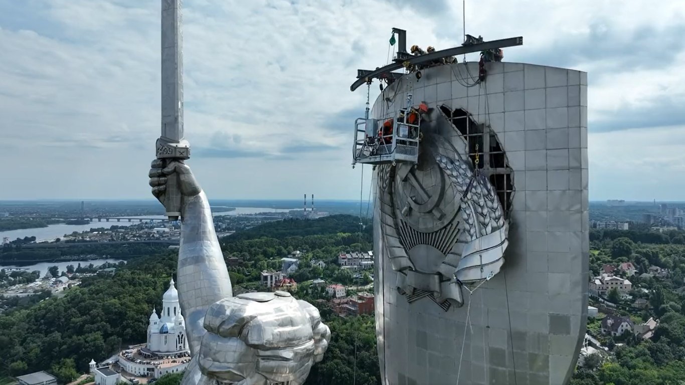 У Києві з монумента "Батьківщина-Мати" продовжують демонтувати радянський герб. Роботи почалися ще 29 липня.