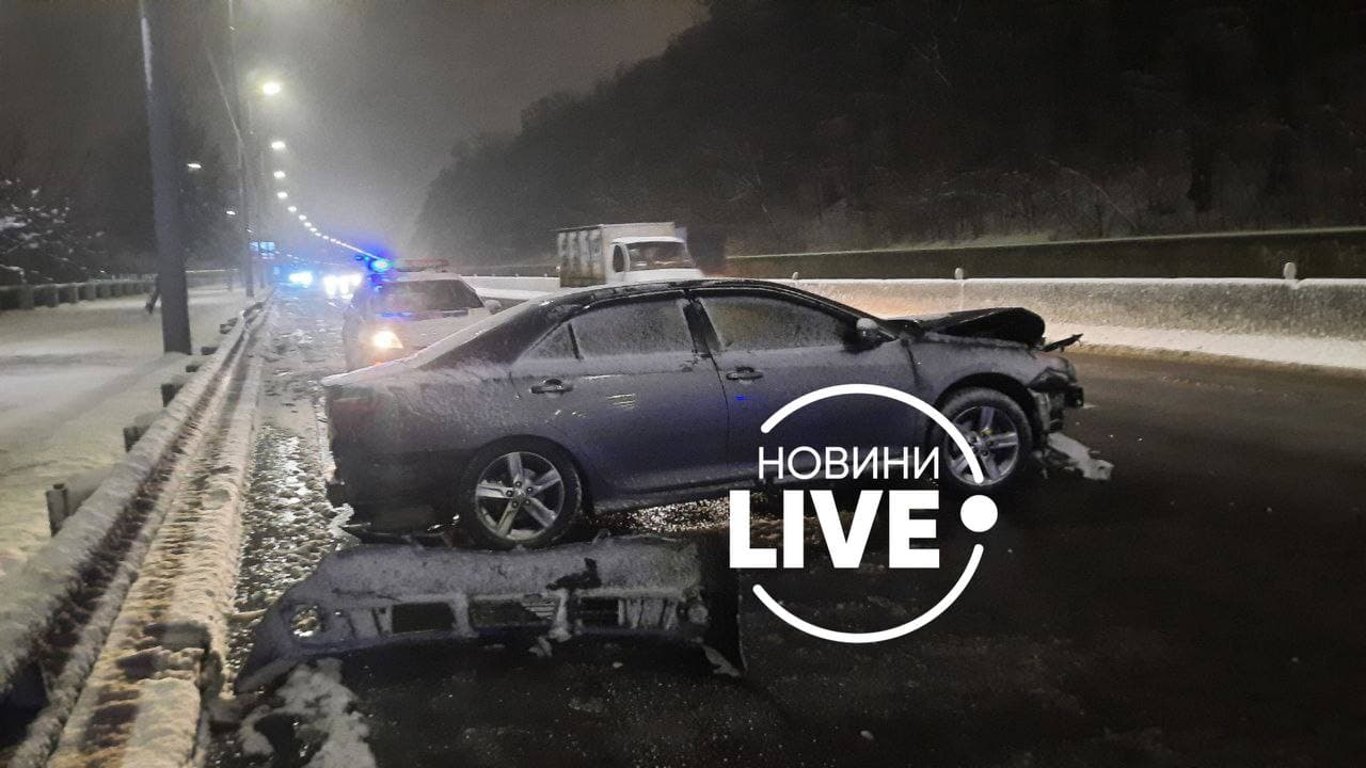 Обидві легкові автівки рухалися в напрямку Подолу, коли один із транспортних засобів кинуло в бордюр, а потім в автомобіль, який рухався сусідньою смугою. Від удару автомобілі зазнали значних пошкоджень, а також їх розкидало по дорозі.