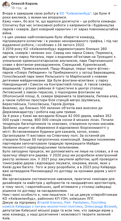 "Вчора я завершив свою роботу в КО "Київзеленбуд". Це були 4 роки викликів, з якими ми впоралися. Кажу "ми", бо все те, що вдалося досягнути — це робота команди. Спочатку був час інтенсивної роботи з капремонтів і будівництва парків і скверів. Далі ковідний карантин і от зараз повномасштабна війна. І в цих умовах найголовнішим було зберегти команду, підтримувати колектив: і в умовах ненормованого графіка, і під час віддаленої роботи, і особливо з 24 лютого 2022", — написав екскерівник підприємства.