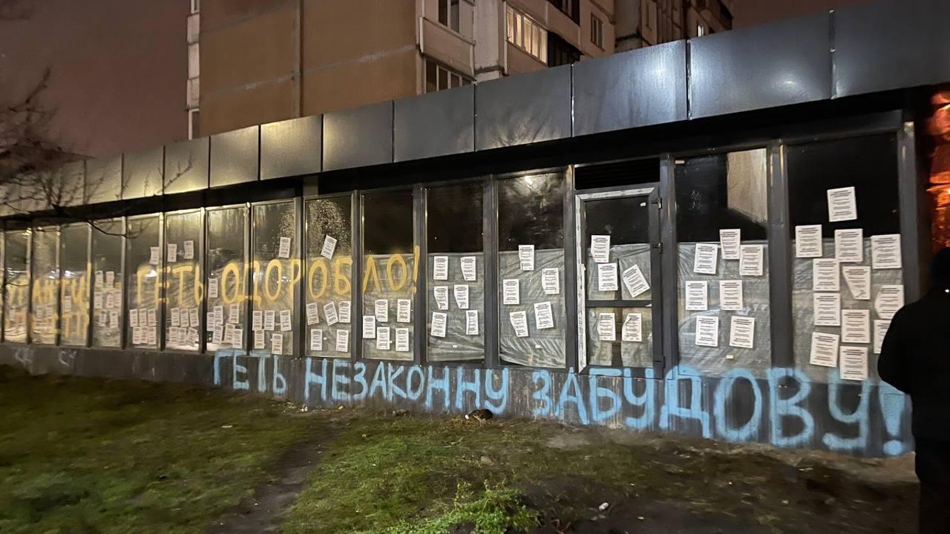 Як відомо, величезну прибудову, незаконний забудовник поставив дуже близько до будинку, що не сподобалося невідомим особам. Таким чином вони вирішили нагадати забудовнику, що він не зможе господарювати у дворі киян і написали на забудові: "Геть незаконну забудову".