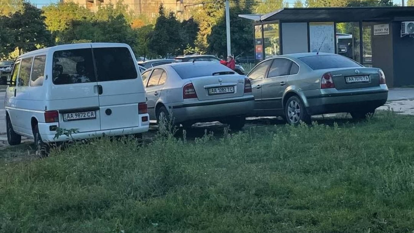 Недалеко від зупинки громадського транспорту, в Оболонському районі, відразу три власники транспортних засобів поставили свої автомобілі на території зеленої зони. Користувачі мережі відразу показали таке нахабне "тріо" на телефон, і розмістили його в мережі з підписом - "троє зі скриньки - однакові з особи".
