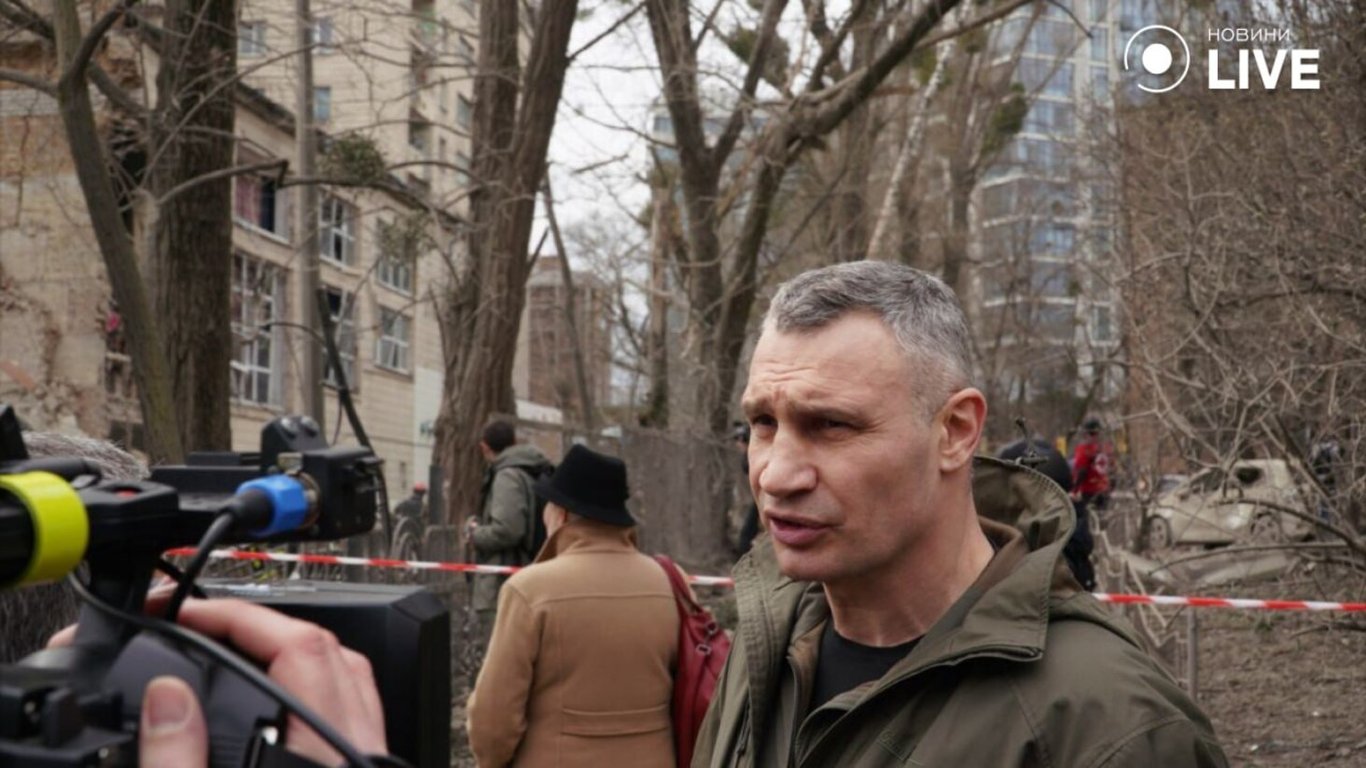 Мер Києва Віталій Кличко відвідав місце, де впали уламки російських ракет після обстрілу столиці 25 березня. Він особисто оглянув руйнування та записав відеозвернення прямо на місці події.