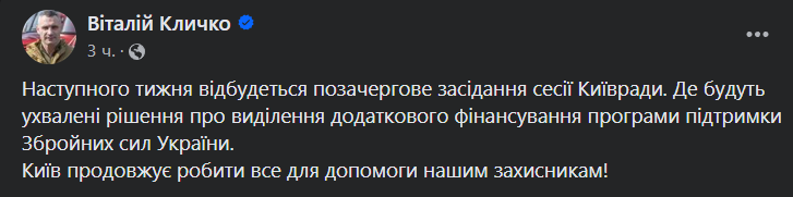 "Наступного тижня відбудеться позачергове засідання сесії Київради. Будуть ухвалені рішення про виділення додаткового фінансування програми підтримки Збройних сил України", — написав Кличко, додавши, що столиця продовжує допомагати українським оборонцям.