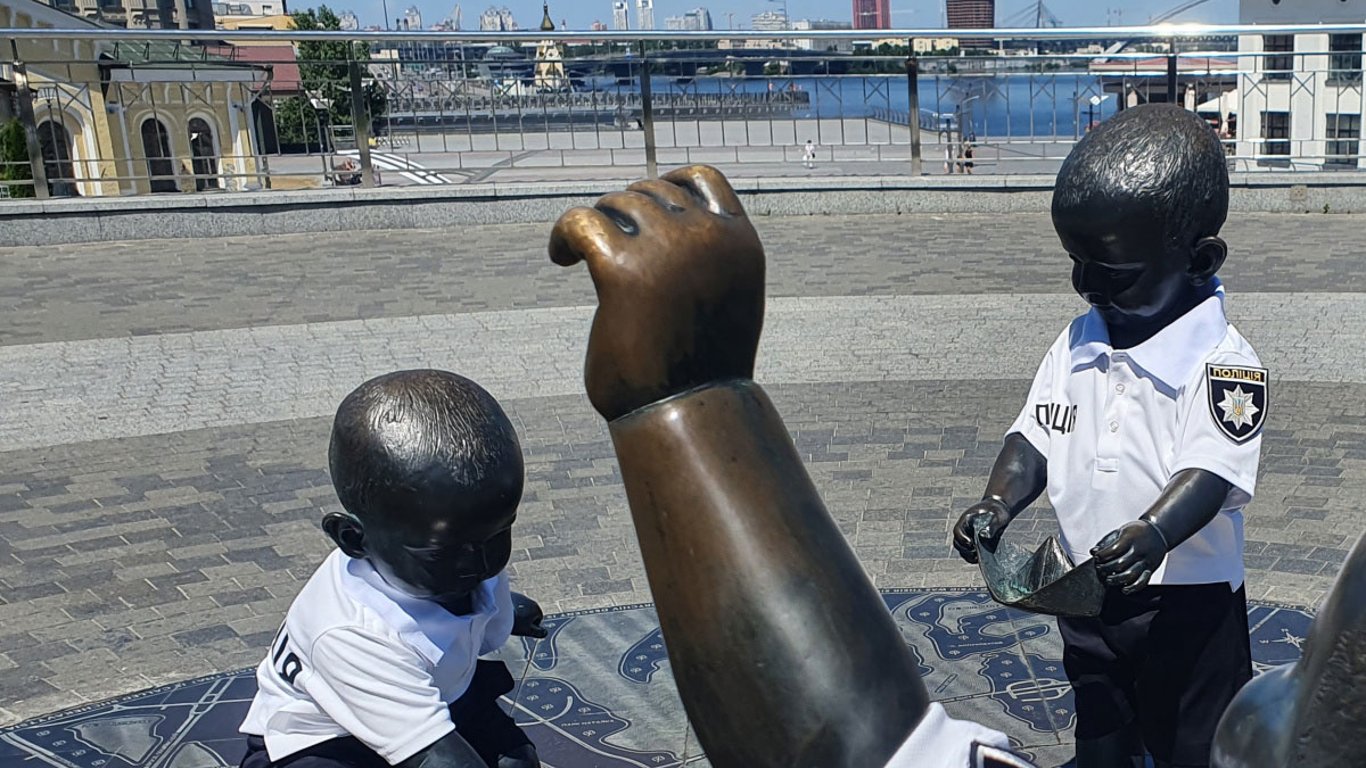 До Дня поліції бронзові малюки-засновники Києва на Поштовій площі отримали нові вбрання. Їх одягли у форму українських поліцейських.