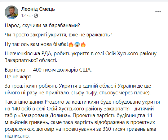 "Шевченківська РДА, робить укриття в селі Осій Хуського району Закарпатської області. Вартістю — $400 тис. Це не жарт. За гроші киян роблять Укриття в єдиній області України де ще нічого ні разу не прилітало", — написав Ємець.