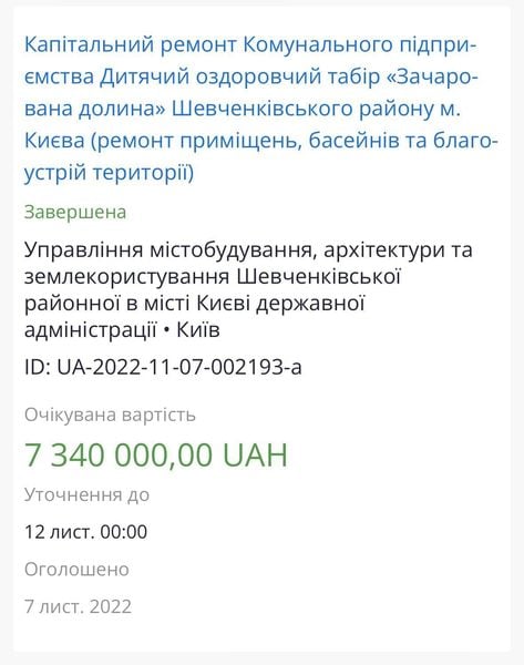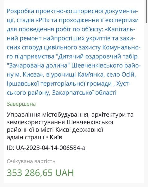 Так, згідно з даними Prozorro, за кошти киян буде побудоване укриття на 140 осіб в селі Осій Хустського району Закарпаття — дитячий табір "Зачарована Долина".