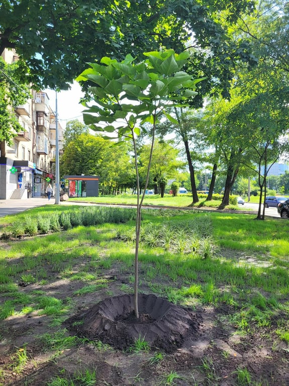 "Цю зелену зону місто створило на локації, яка донедавна була заставлена МАФами і мала дуже неохайний вигляд. Сьогодні тут вже розрослися кущі, злакові трави та багаторічні квіти. Тепер, після рясних дощів, з’явилася нагода висадити у спеціально підготовлений ґрунт і дерева, які гарно зарекомендували себе у міських умовах. Це катальпи або як їх ще називають "дерева щастя", — директор Департаменту захисту довкілля та адаптації до зміни клімату Олександр Возний.