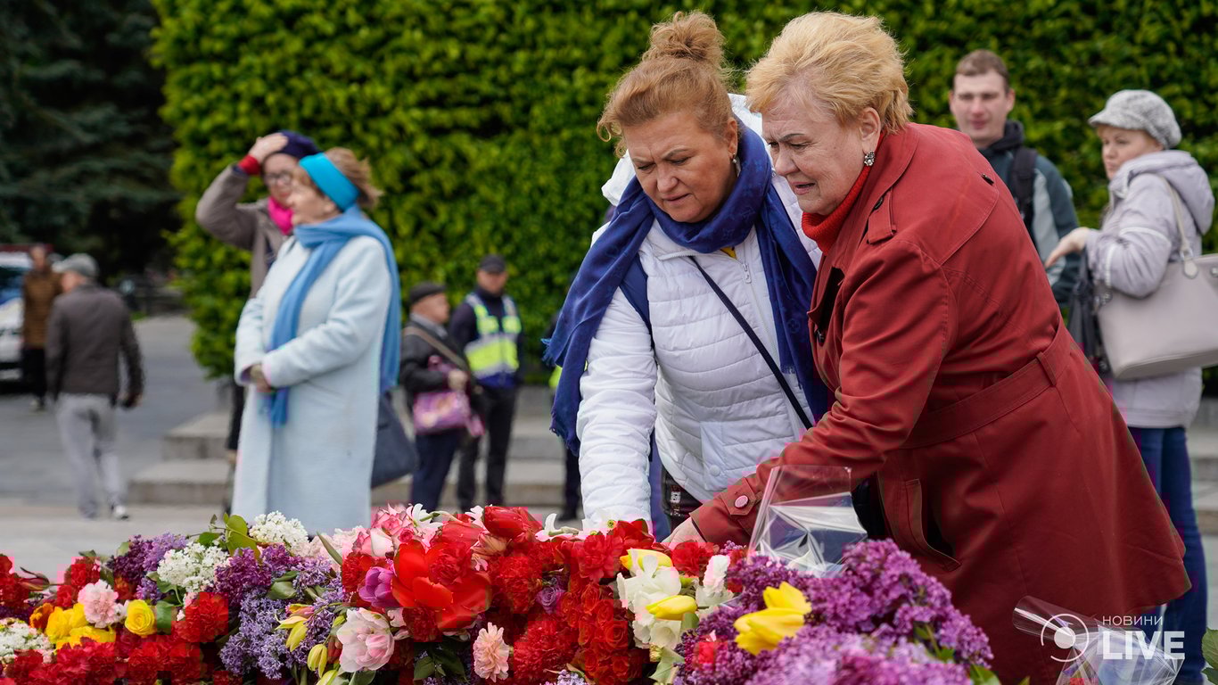 Хоча в Україні пропонують зробити 8 травня Днем пам'яти та перемоги над нацизмом, деякі кияни принесли квіти до парку Слави 9 травня. Фото: Новини.LIVE