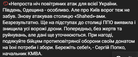 "Непроста ніч повітряних атак для всієї України. Південь, Одещина — особливо. Але про Київ ворог теж не забув. Знову атакував столицю "Shahed"-ами. Безрезультатно. Ще на підступах до столиці ППО виявила і знищила усі ворожі дрони", — йдеться в повідомленні КМВА.