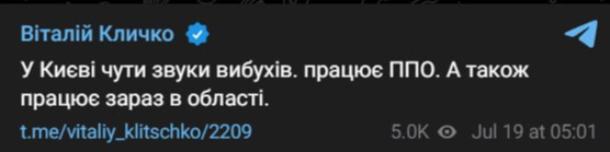 19 липня близько п'ятої ранку у столиці України лунають вибухи. Практично зразу була знову оголошена повітряна тривога.