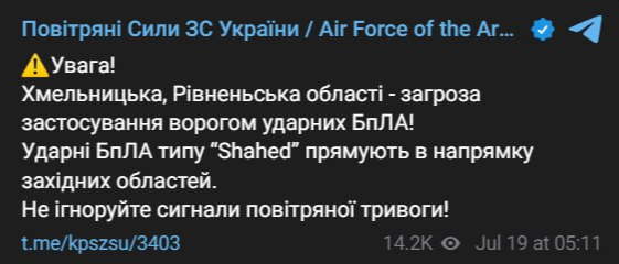 Повітряна тривога в Україні вночі 19 липня