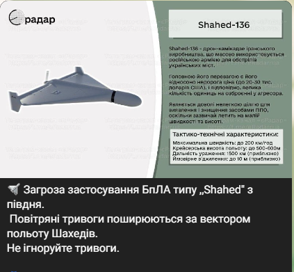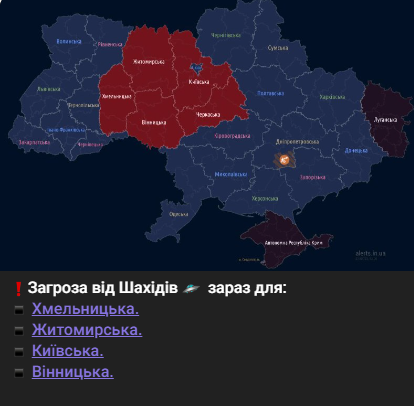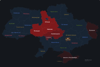 Миніторингорві канали повідомляють про поширення повітряної тривоги по всій території України. Так, повітряна тривога лунає у: