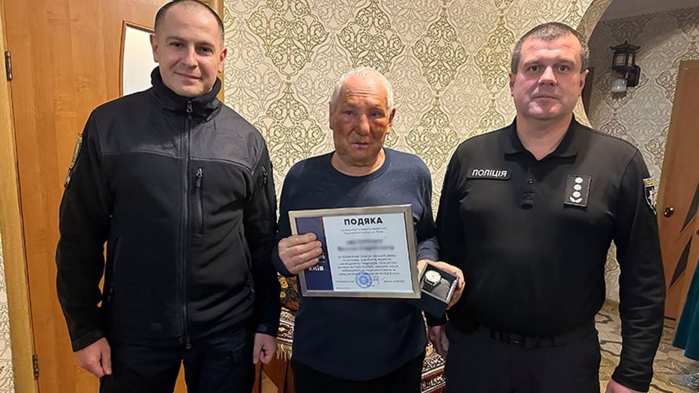 Столичні правоохоронці відвідали Василя Андрійовича, який сів у палаюче авто і врятував від загоряння сусідні машини. Поліцейські Святошинського управління вручили подяку від начальника поліції Києва, а також зробили подарунок для чоловіка. Він отримав іменний годинник від правоохоронців.