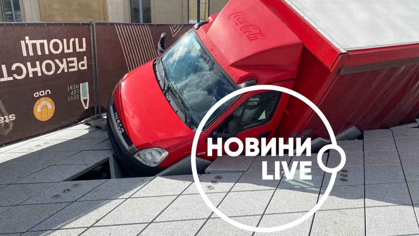 Прямо у новий фонтан: у Києві на Арсенальній площі вантажівка провалилась крізь землю. Фото