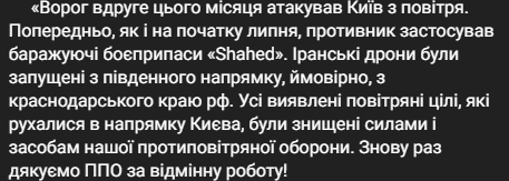 Повідомляється, що противник застосував баражуючі боєприпаси "Shahed". Іранські дрони були запущені з південного напрямку, ймовірно, з краснодарського краю РФ. Усі виявлені цілі були знищені.