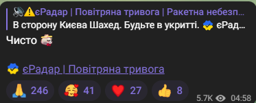 "Для Києва повітряна тривога повʼязана із загрозою ворожих ударних БпЛА! Перебувайте в укриттях до відбою тривоги", — повідомив начальник КМВА Сергій Попко.