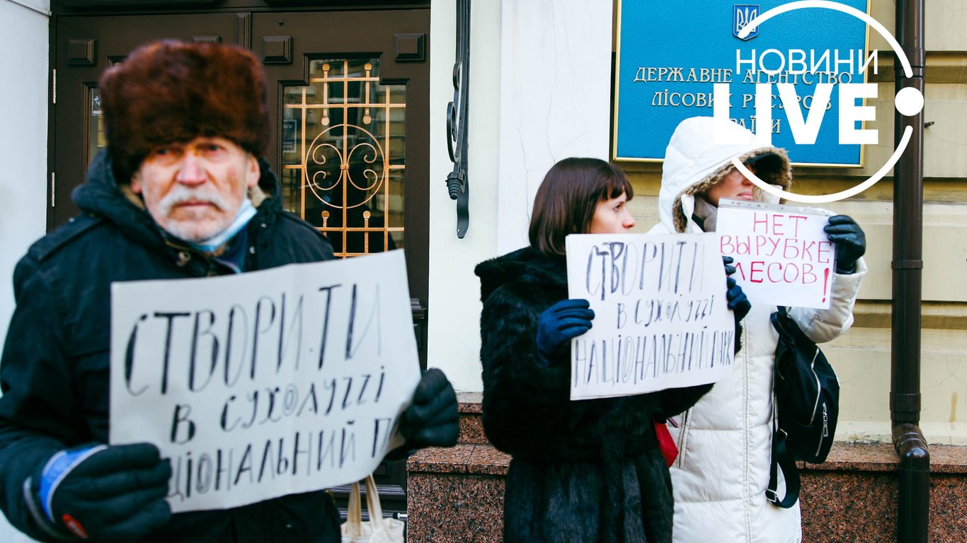 Утром в понедельник 20 декабря, возле здания Государственного агентства лесных ресурсов на улице Шота Руставели, 9а, в Киеве – звуки бензопилы, барабанная дробь и возгласы в рупор: "Не допустим уничтожения лесов!", "Болоховец, выходи!" и люди с транспарантами.