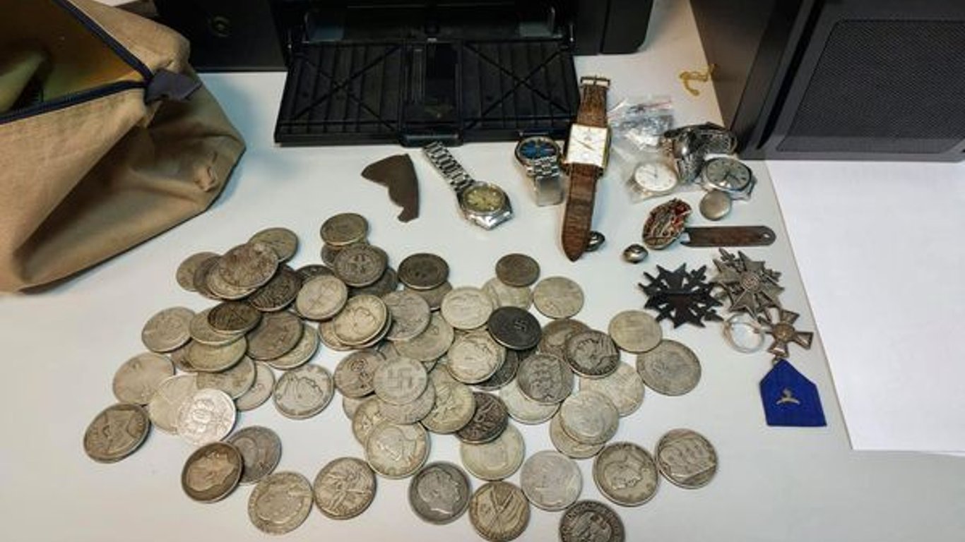"У мужчины нашли каски, ложки, вилки, консервный ключ, 80 монет из белого металла, пуговицы, "газбак" - емкость для хранения противогаза, фляги, бинокли, пол-литровая масленка, костяное ожерелье с черепами, испанские кресты - награда для немцев, участвовавших в Гражданской войне в Испании 1936-1939 годов, военные авиационные часы люфтваффе, скульптурную голову Гитлера", - сообщают в пресс-службе.