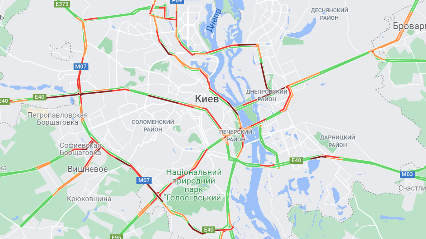 Перегруженный трафик традиционно наблюдается на центральных дорогах столицы. В пробках стоят проспект Героев Сталинграда, проспект Победы, Набережное шоссе, Кирилловская, Семена Скляренко, Копыловская, Белицкого, Бережанская, Сырецкая, Академика Заболотного.