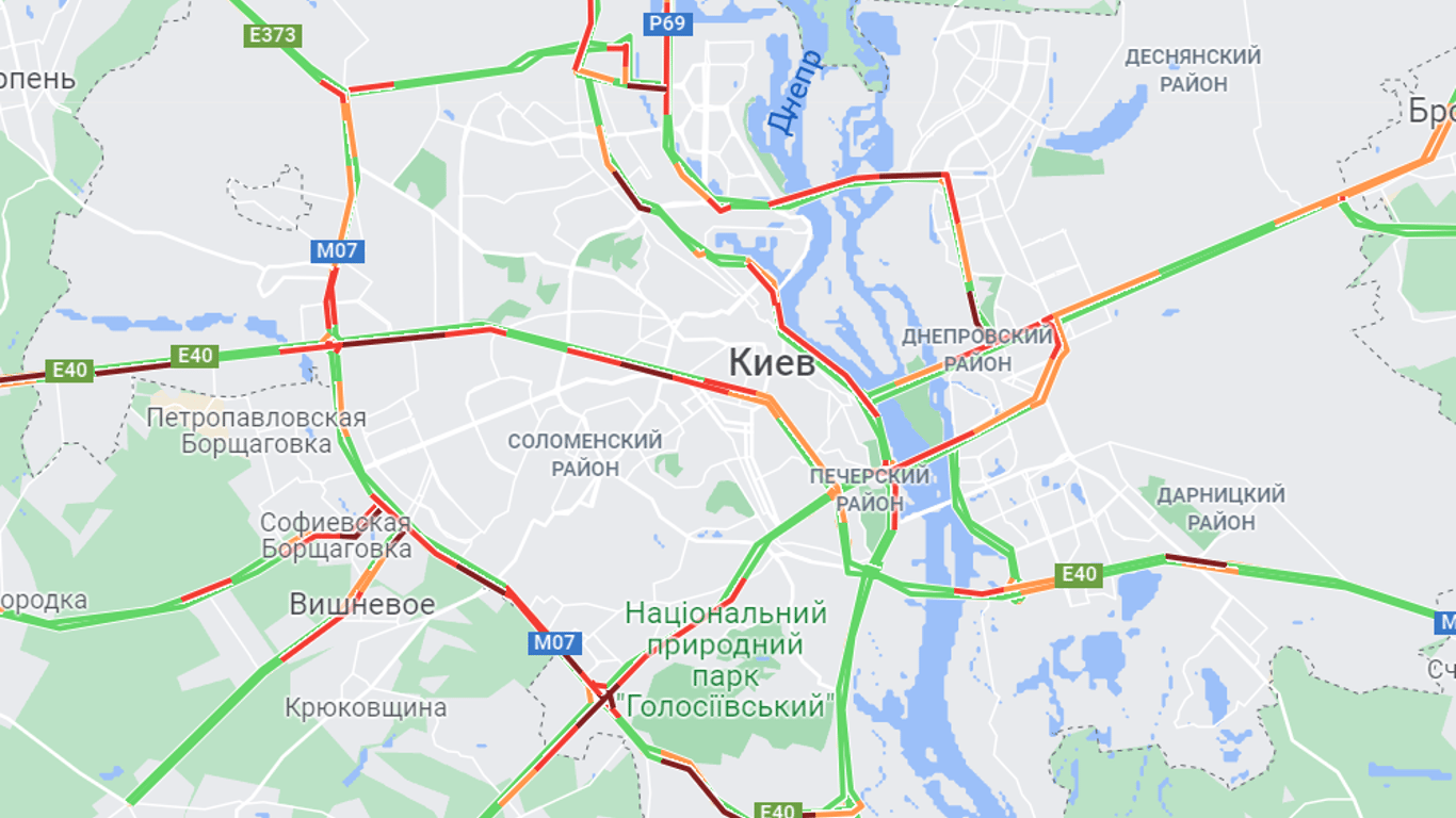 Традиционно перегруженный график наблюдается на центральных дорогах столицы. В пробках стоят проспект Героев Сталинграда, Набережное шоссе, проспект Победы, улицы Копыловская, Кирилловская, Семена Скляренко, Белицкая, Бережанская, Академика Заболотного, Сырецкая.
