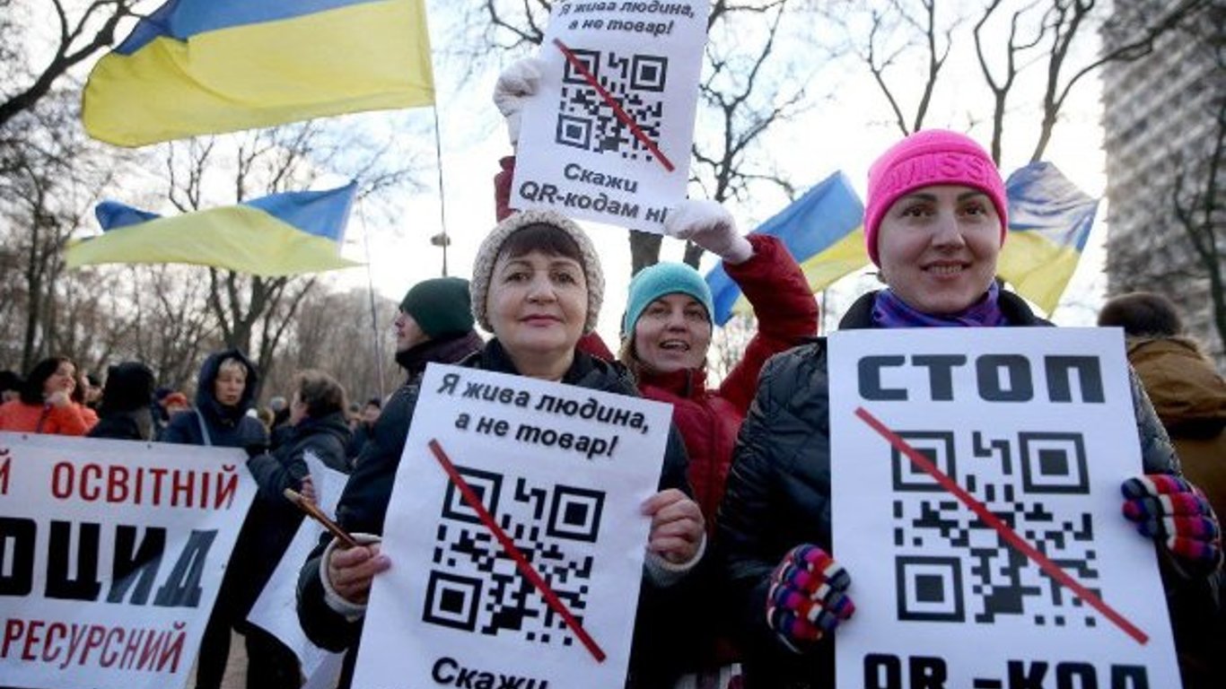 В Киеве, в среду, 24 ноября, продолжаються акции протестов антивакцинаторов, на плакатах протистующх заметили необычные QR-коды, которые несмотря на то, что они перечеркнуты возможно отсканировать.