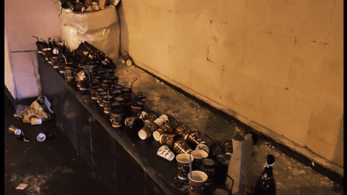 По словам женщины, близлежащие улицы на Софийской площади превратили в мусорную свалку. На опубликованном фото мы видим, что на парапетах, которые установлены на улицах, в ряд лежат горы одноразовых бумажных стаканчиков.