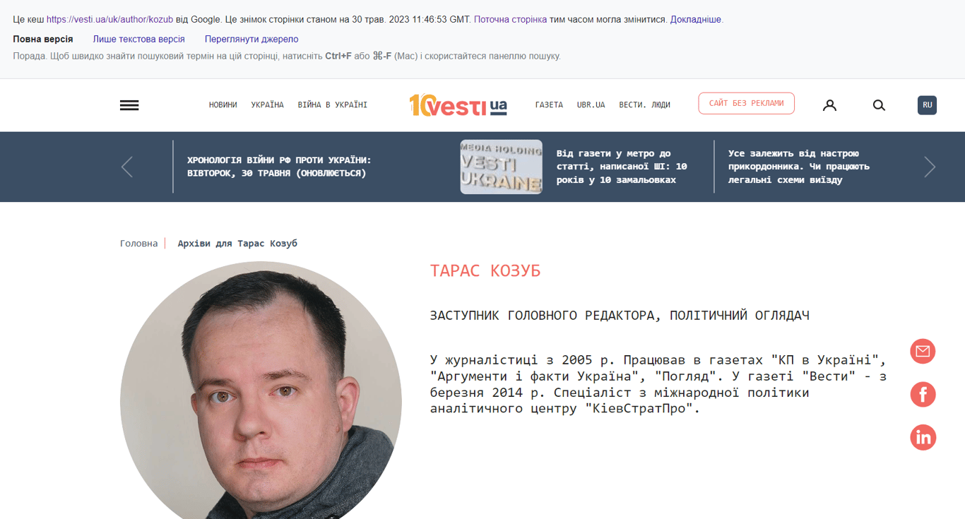 Новини.LIVE проверила сайт Vesti.ua и обнаружила, что журналиста Тараса Козуба удалили из графы авторов сайта. Об этом свидетельствуют кэш-данные Google за 30 мая 2023 года.
