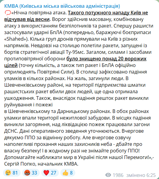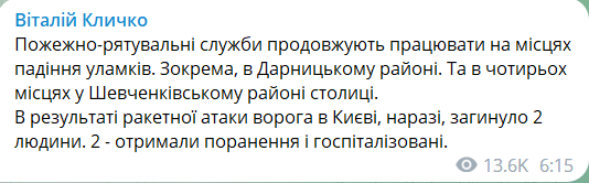 "Пожарно-спасательные службы продолжают работать на местах падения обломков. В частности, в Дарницком районе. И в четырех местах в Шевченковском районе столицы. В результате ракетной атаки врага в Киеве погибли 2 человека. 2 — получили ранения и госпитализированы", — отметил мэр города.