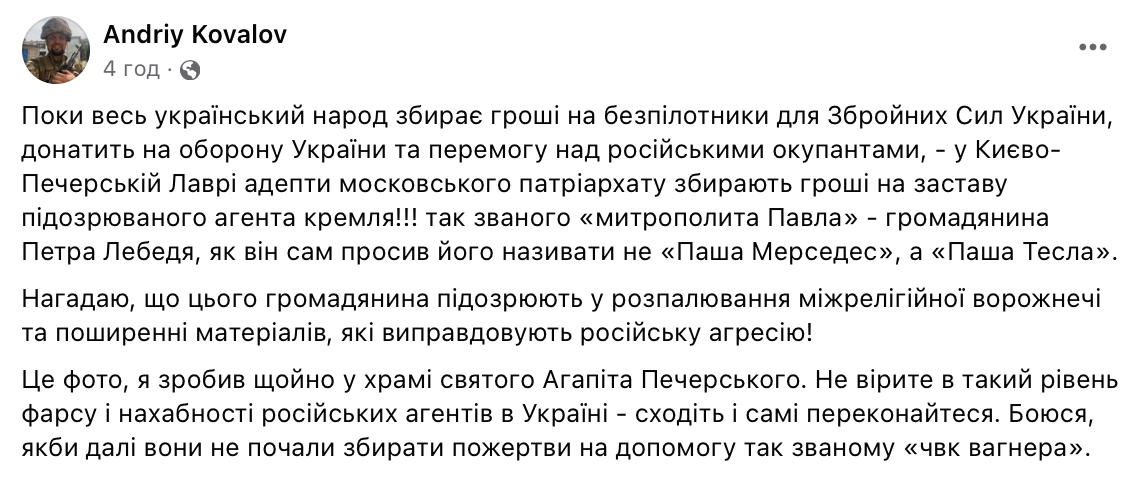 "Пока весь украинский народ собирает деньги на беспилотники для Вооруженных сил Украины, донатит на оборону Украины и победу над российскими оккупантами, в Киево-Печерской лавре адепты Московского патриархата собирают деньги на залог подозреваемого агента Кремля, так называемого "митрополита Павла". Как он сам просил его называть не "Паша Мерседес", а "Паша Тесла", — написал Ковалев.