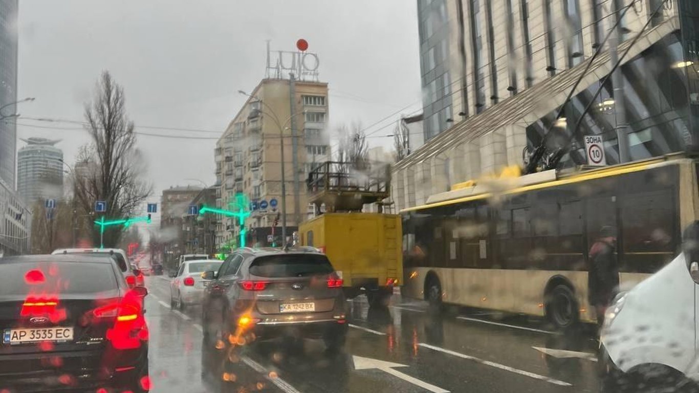 Также отмечается, что все движения остановилось с моста Патона и в сторону центра города, неофициальная причина от киевлян из сети — погода, а именно ледяной дождь, который создаёт каток не только на дорогах, но и создал ледяную "обмотку" для проводов, от которых питает электричество наземный транспорт.