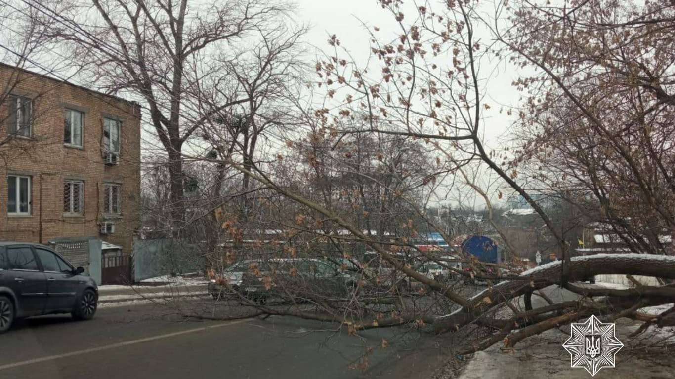 На улице Ольжича, которая находится в Шевченковском районе города упало огромное дерево на проезжую часть, что способствовало затруднительному движению транспорта, в частности - автомобилей.