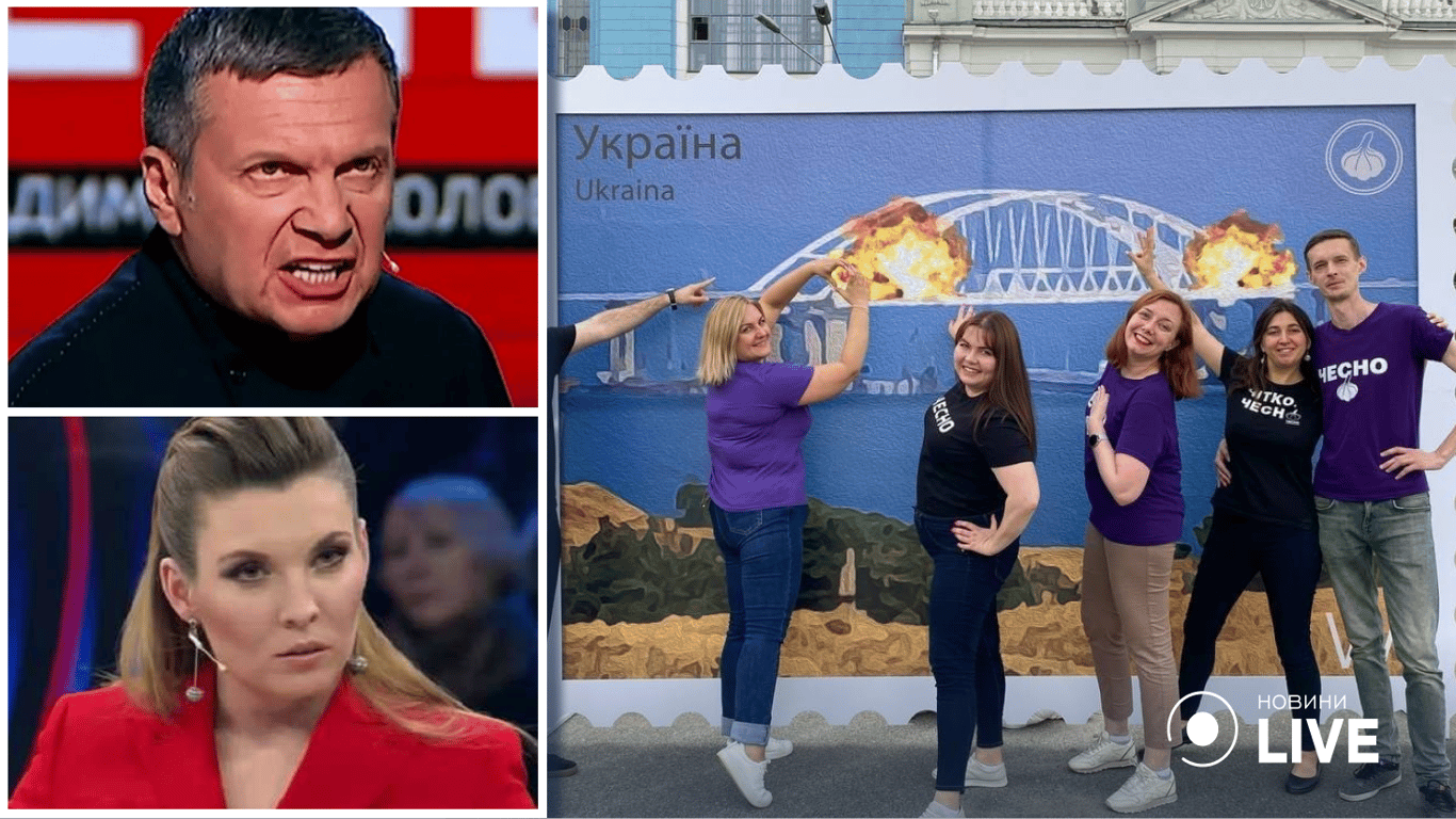 В Киеве установили фотозону с изображением Крымского моста в огне. Такой дизайн не оставили без внимания самые главные пропагандисты путинского режима.