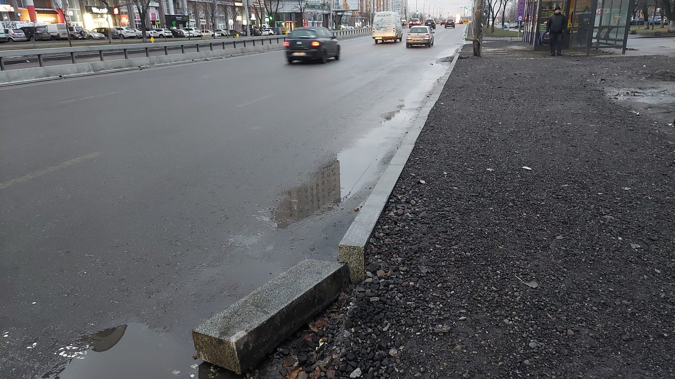 В Оболонском районе Киева, на улице Героев Сталинграда после недавнего ремонта дорог и обновления бордюров, вместе со снегом начал сходить и бордюр.