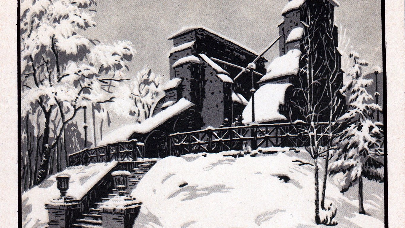 На одной из открыток можно узнать заснеженную Владимирскую улицу, на которой расположен знаменитый красный корпус Киевского национального университета имени Тараса Шевченко.