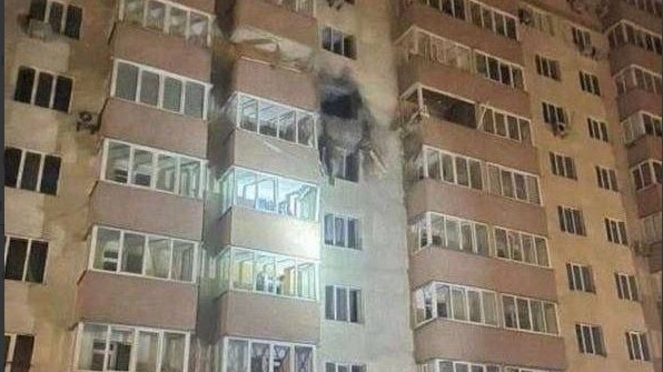 На опубликованных видно, что вследствии попадания осколков снаряда, повреждено несколько этажей многоэтажного дома, в частности выбиты окна во многих квартирах. Также есть разрушения конструкции.