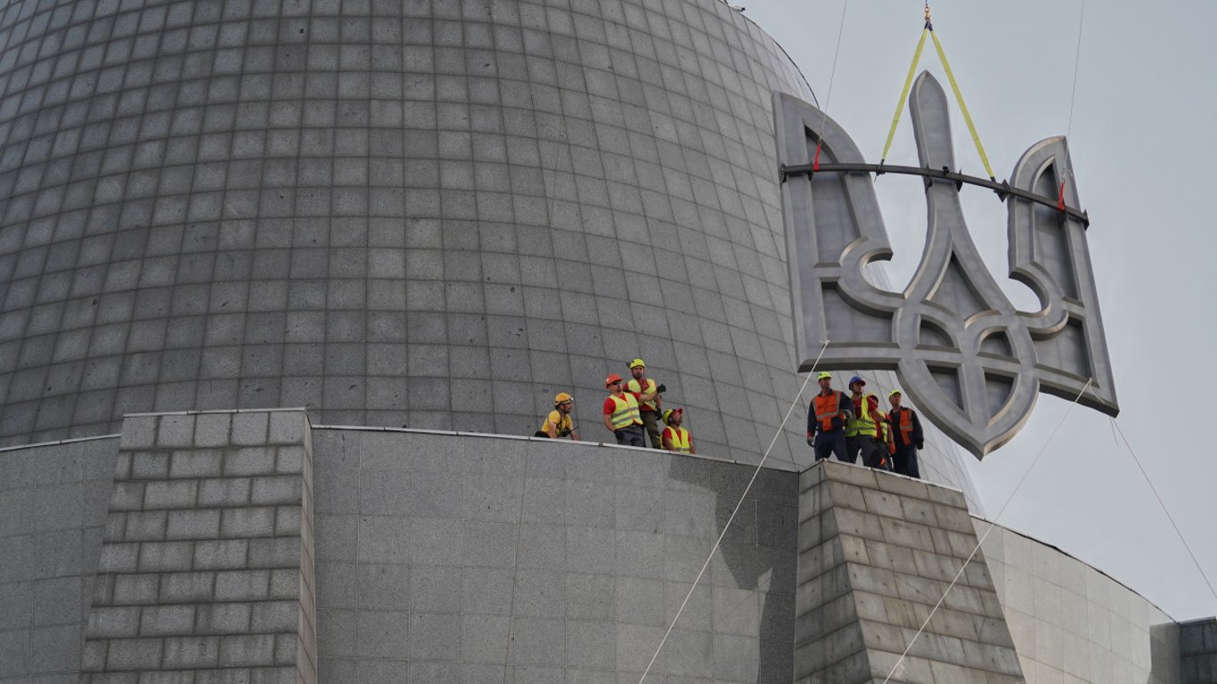На оприлюднених відео можна побачити, що Тризуб повністю підняли до щита на монументі "Батьківщина-Мати". Залишилось лише його встановити.