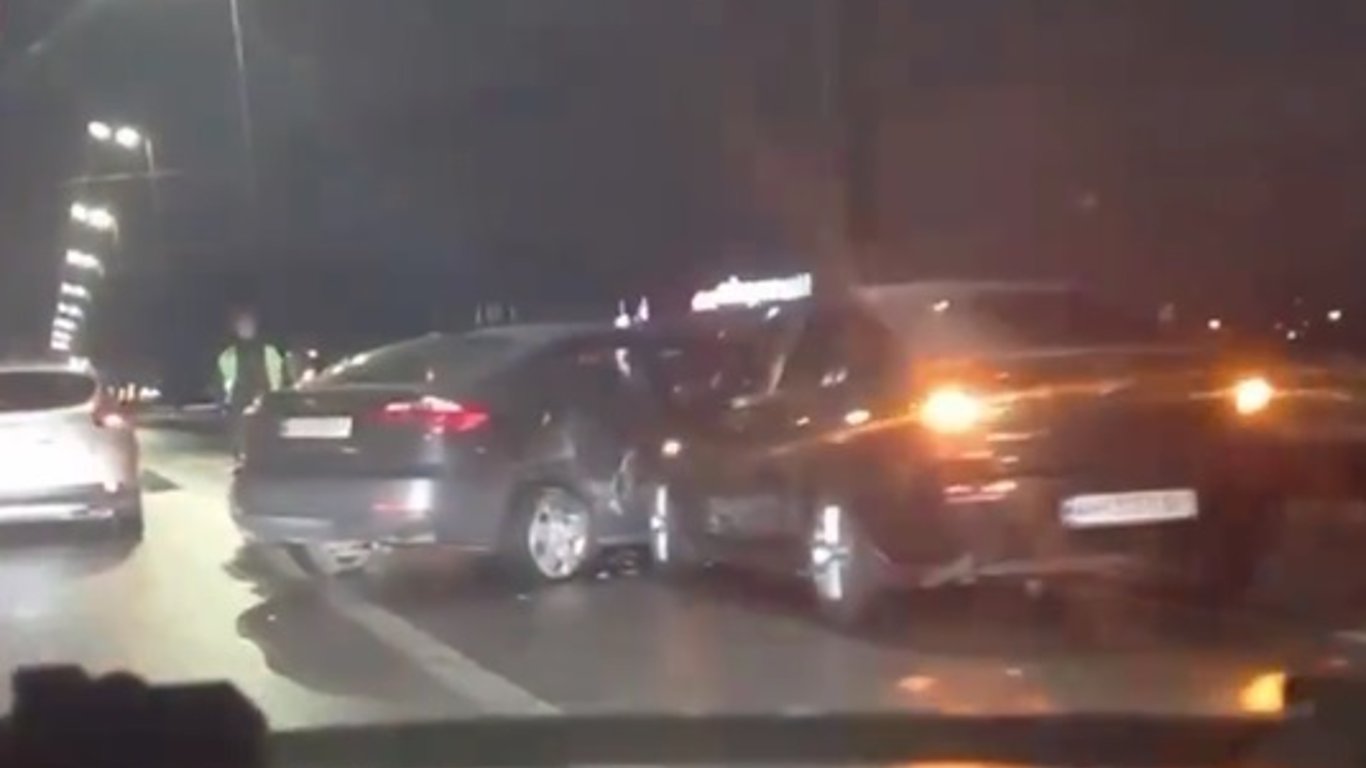 На відео, що зняте свідком, видно, що в напрямку Троєщини одна машина вкарбувалась в іншу, яку розвернуло на 90 градусів і так вони і залишилися в смузі громадського транспорту. Трохи далі в сусідній смузі стоїть "на аварійках" третє авто.