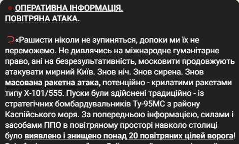 Повідомляється, що ворог цілив по Києву крилатими ракетами типу Х-101/555. Пуски були здійснені традиційно - із стратегічних бомбардувальників Ту-95МС з району Каспійського моря.
