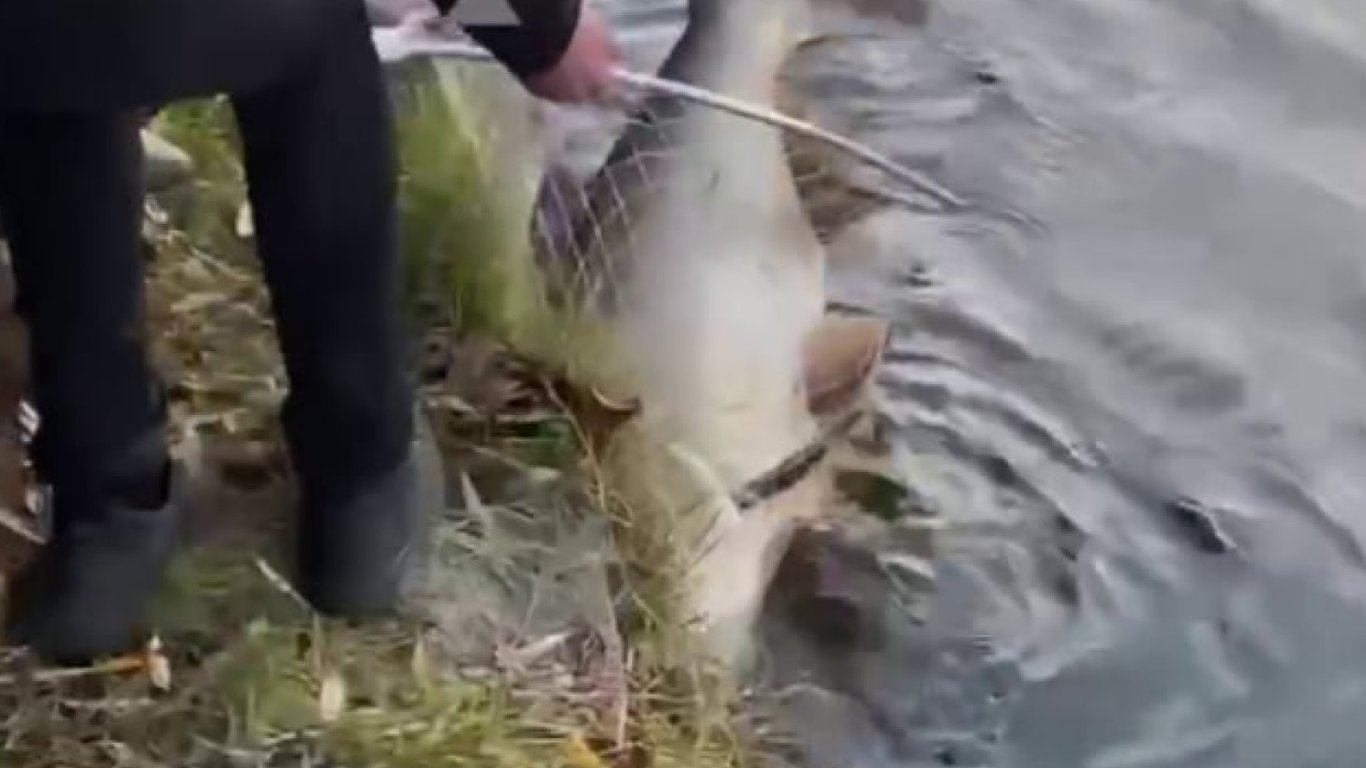 На відео можна побачити, як з води чоловіки дістають велику рибу. Одному з рибалок вдалося її зловити. Люди, які спостерігали за цим, були вражені розмірами риби.