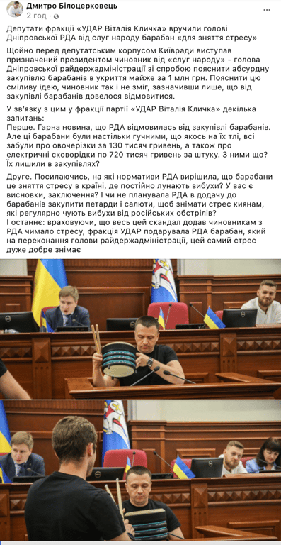 "Щойно перед депутатським корпусом Київради виступав призначений Президентом чиновник від "Слуги народу" голова Дніпровської райдержадміністрації зі спробою пояснити абсурдну закупівлю барабанів для укриттів майже за 1 млн грн. Пояснити цю сміливу ідею, чиновник так і не зміг, зазначивши лише, що від закупівлі барабанів довелося відмовитися", — зазначив Білоцерковець.