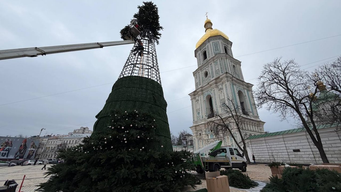 У п'ятницю, 28 листопада, на Софійській площі в Києві розпочали встановлювати головну ялинку України. Каркас 16-метрового новорічного дерева вже зібрано.