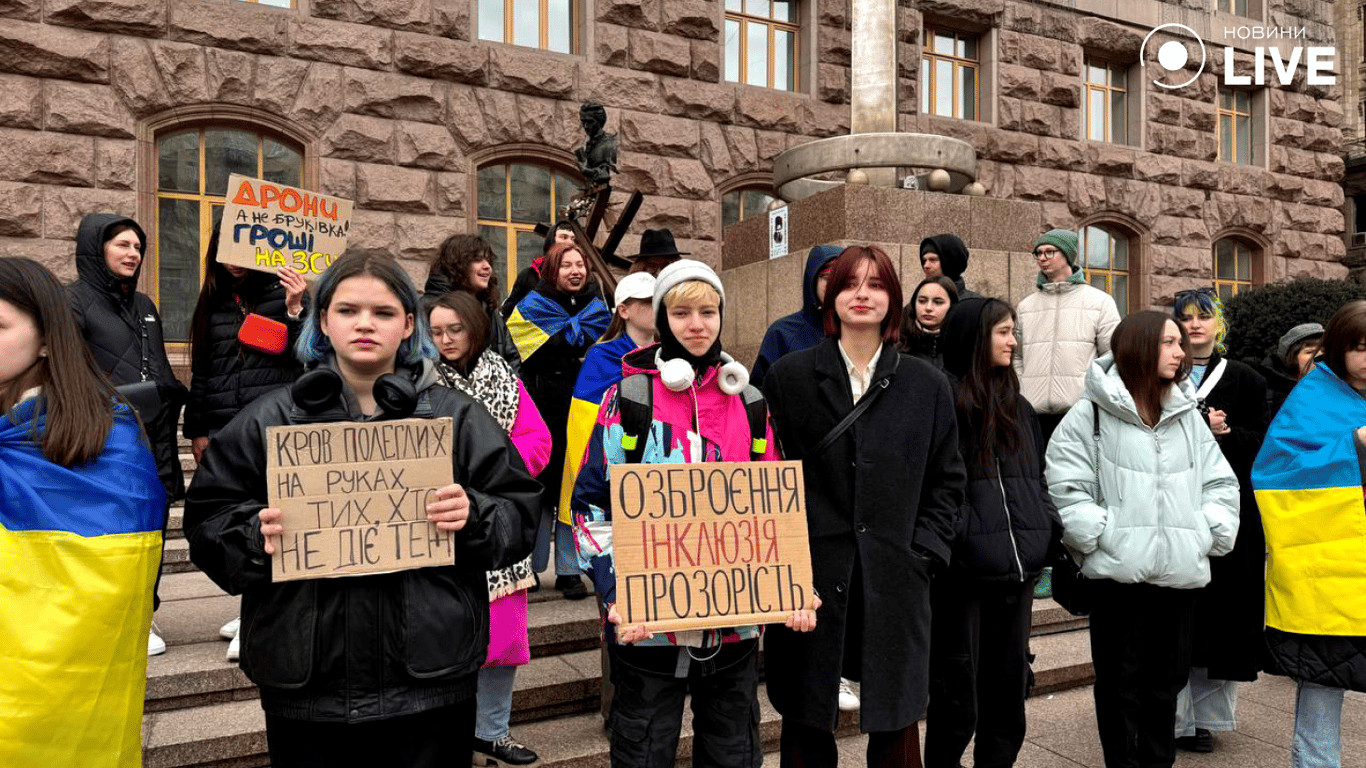 У Києві під стінами міської адміністрації пройшла акція протесту "Гроші на ЗСУ" у суботу, 9 березня. Небайдужі українці зібралися в центрі столиці з вимогою про більше фінансування воїнів на фронті.