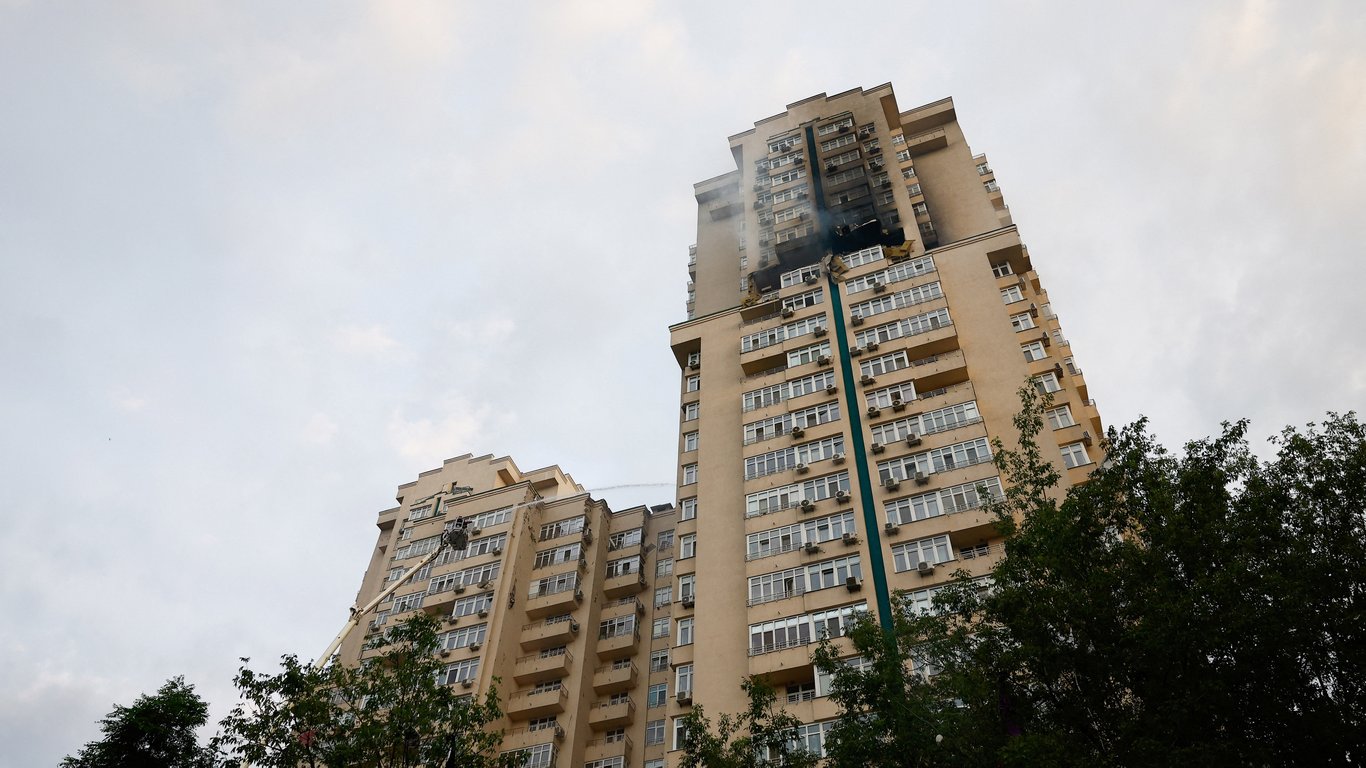 "Внаслідок влучання уламків в 25-поверховий будинок в Соломʼянському районі сталося часткове руйнування будівельних конструкцій на 16, 17, 18, 19 поверхах (18-найбільше) будівлі із загораннями окремими осередками по поверхах", — йдеться у повідомленні.
