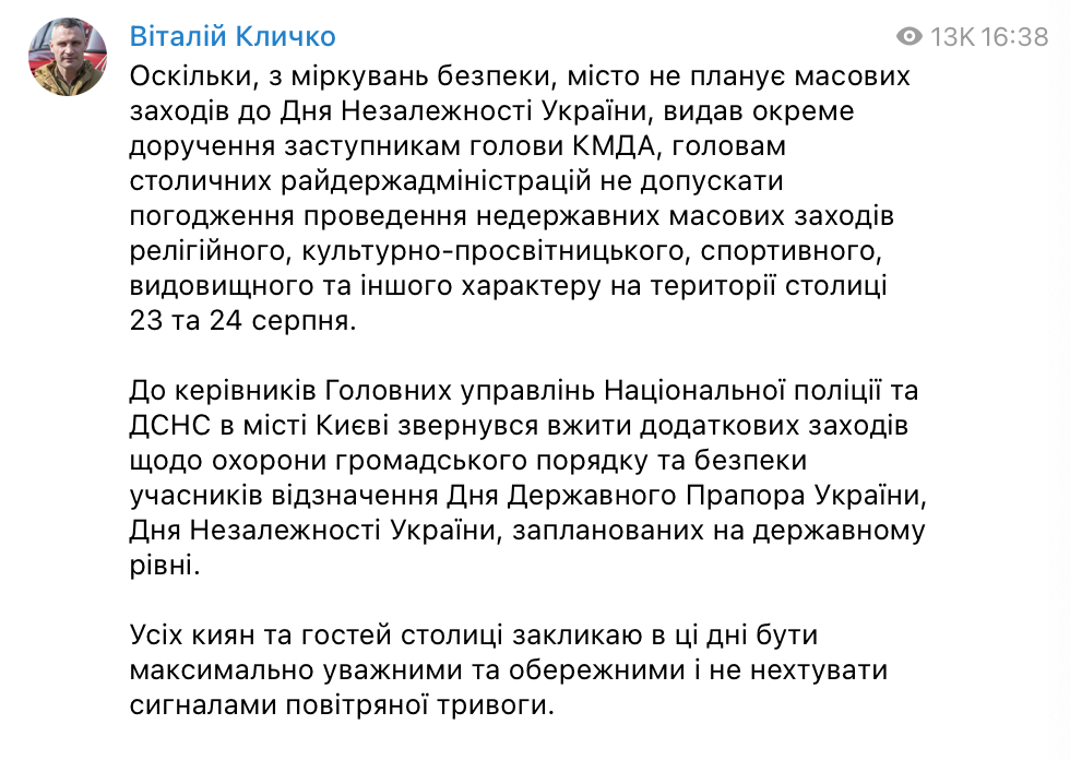 "Оскільки з міркувань безпеки місто не планує масових заходів до Дня Незалежності України, видав окреме доручення заступникам голови КМДА, головам столичних райдержадміністрацій не допускати погодження проведення недержавних масових заходів релігійного, культурно-просвітницького, спортивного, видовищного та іншого характеру на території столиці 23 та 24 серпня", — сказав Кличко.
