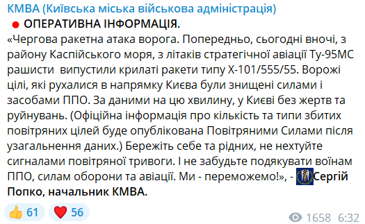 Також у КМВА додали, що офіційна інформація з'явиться дещо пізніше від Повітряних Сил.