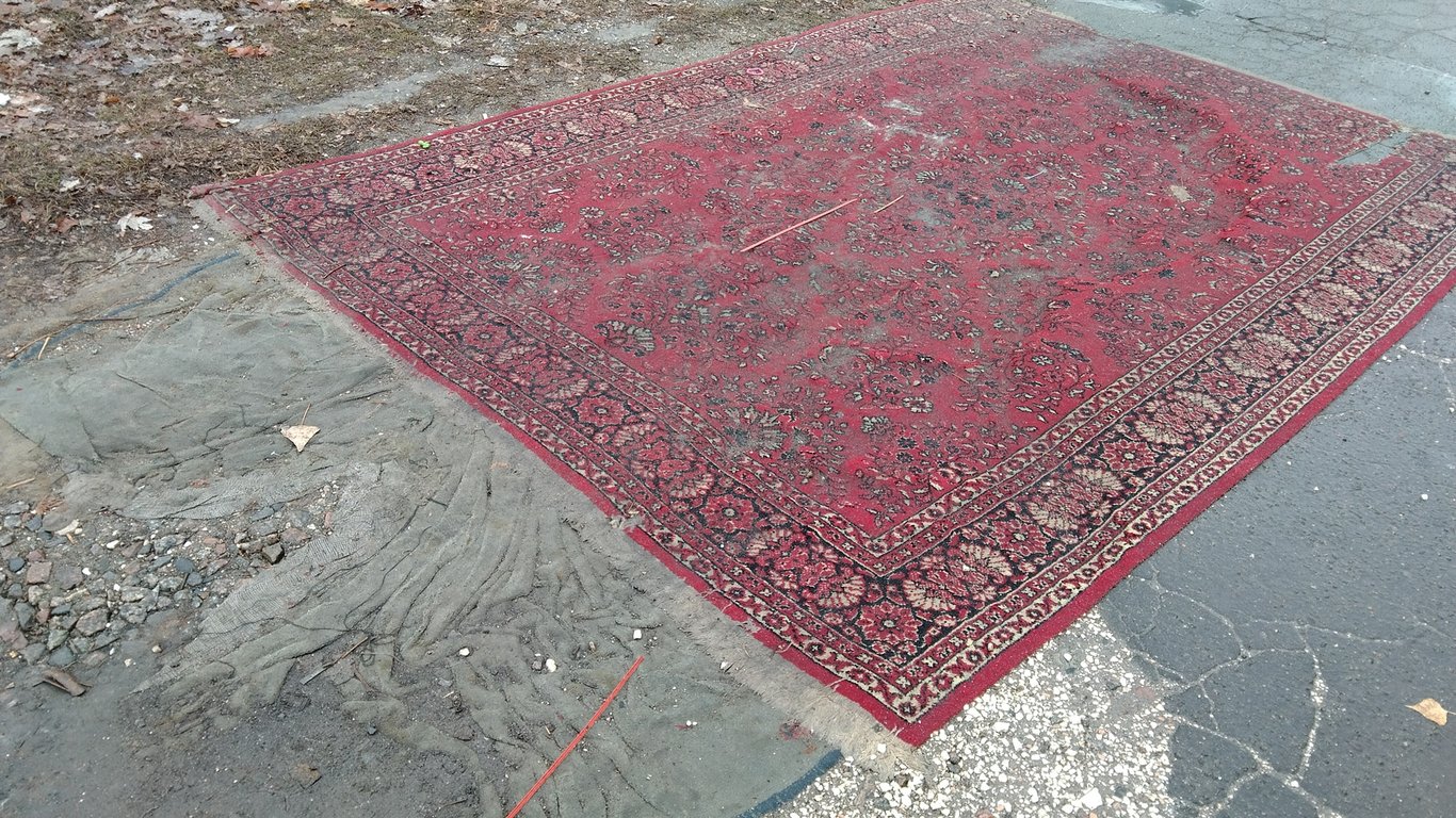 На опублікованих фото видно, що посеред дороги зяє величезна діра. Зверху лежить килим радянського типу, пристойно зношений. Неподалік лежить ще один килим, новіший. По всій видимості його поклали недавно. Хто постелив покриття - невідомо.