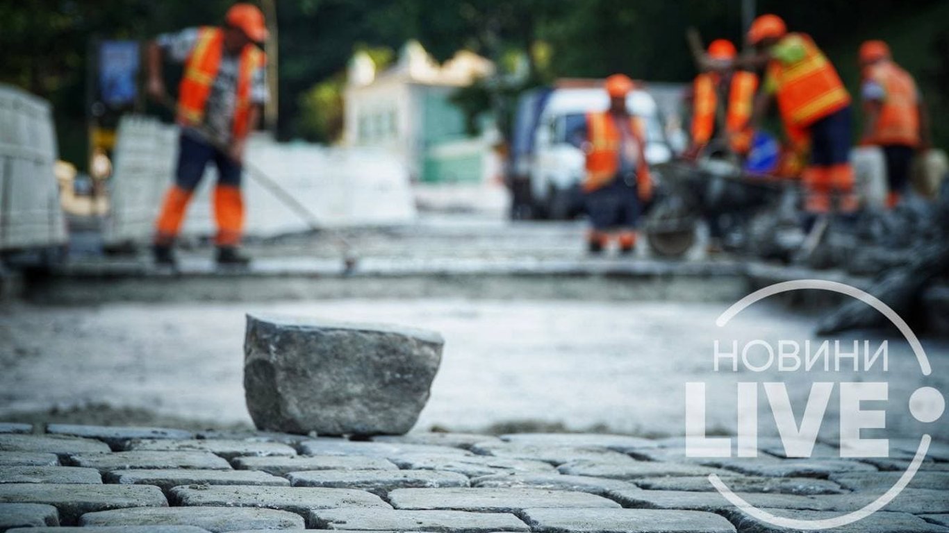 У столиці триває ремонт Володимирського узвозу, розпочатий ще у 2021-му. Нині комунальники оновлюють бруківку на середніх смугах дороги.